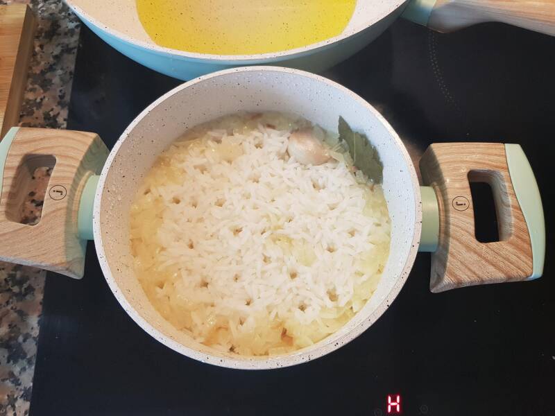 3. Adicione a caneca de arroz basmati, mexa bem e deixe cozinhar uns 2-3 min.