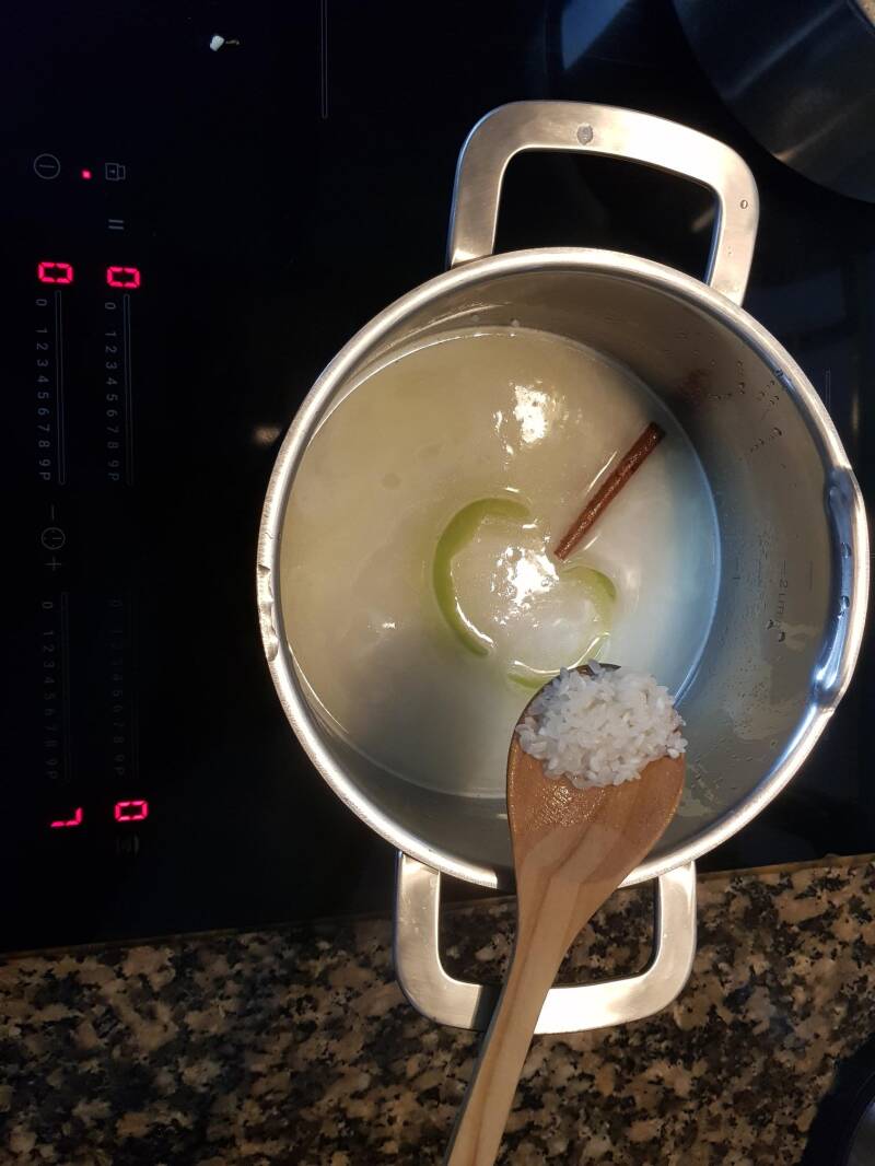 1. Colocar a água num tacho com o pau de canela, a casca de limão, a manteiga e o arroz.