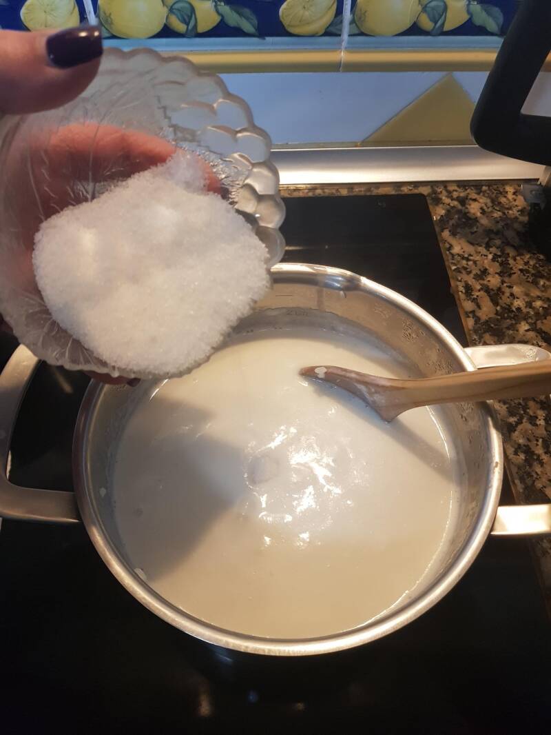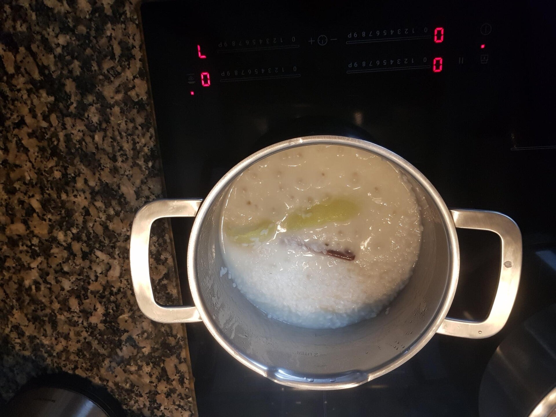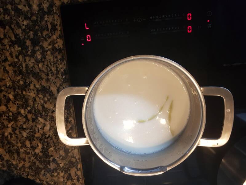 3. Juntar 1L de leite pré aquecido e mexer de vez em quando até o arroz estar cozido.
