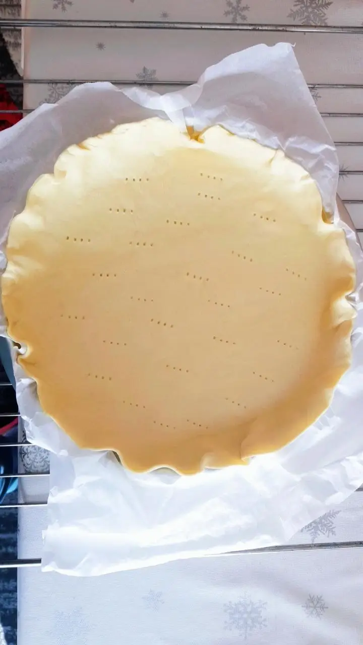 Colocar a massa quebrada na forma, usar o garfo para furar a base da massa e adicionar o preparado