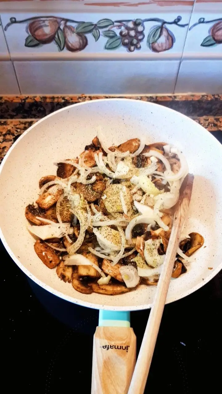 Adicionar os cogumelos e deixar cozinhar durante uns 5-minutos. Temperar com sal, pimenta preta, alho em pó e órgãos.