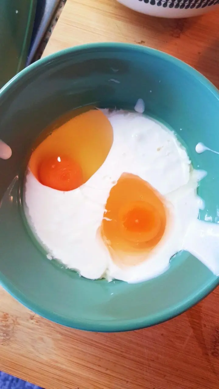 À parte, juntar numa taça as natas e os ovos e bater bem até ficar uma mistura homogénea.