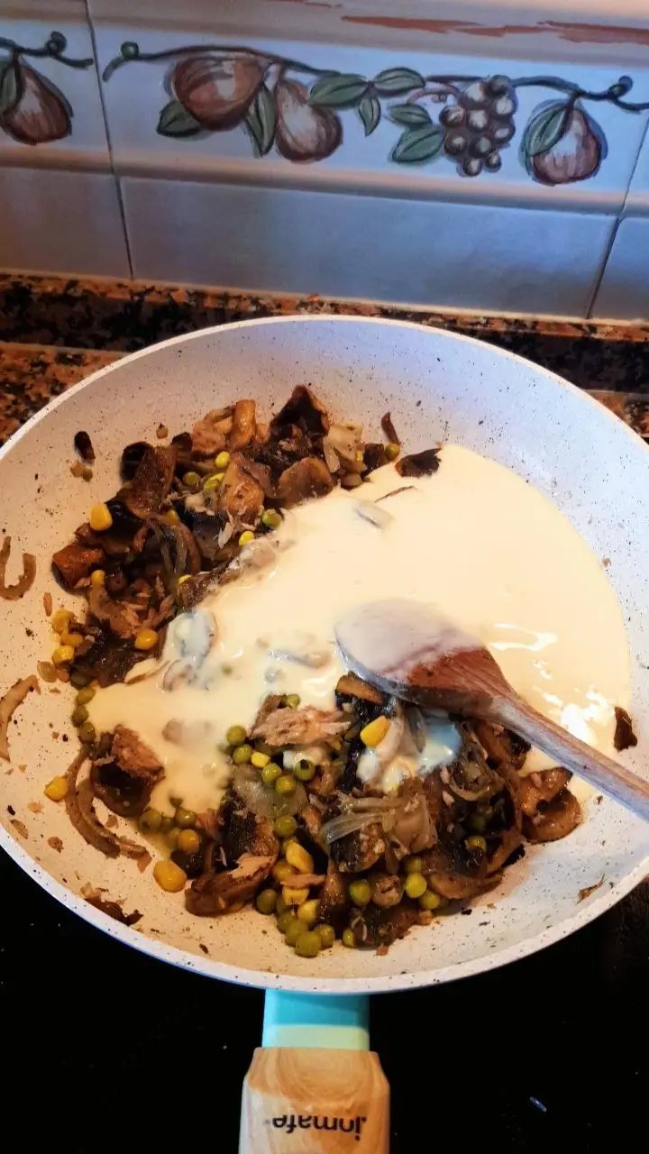 Adicionar o atum e os restantes legumes (ervilhas, milho). Se quiserem adicionar outros legumes, podem fazê-lo.