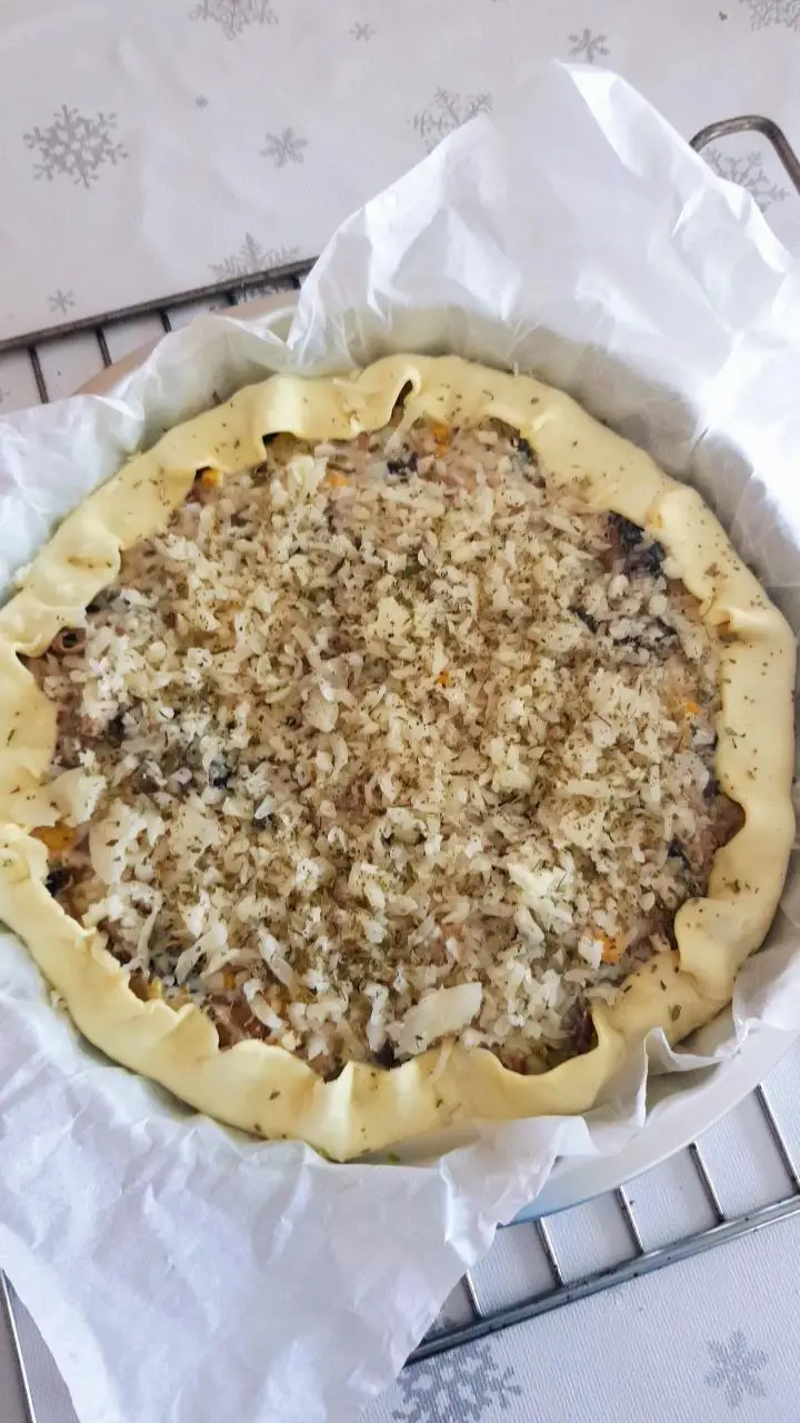 Dobrar as pontas da massa quebrada sobre o preparado e adicionar queijo ralado e órgãos.