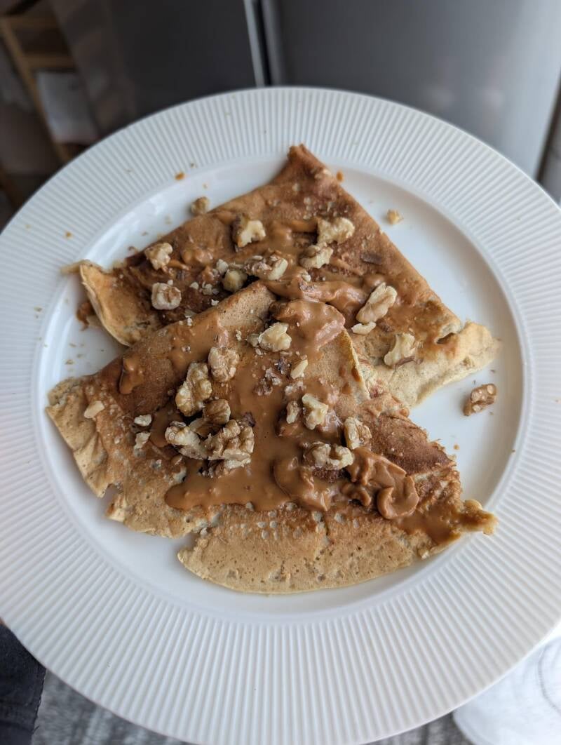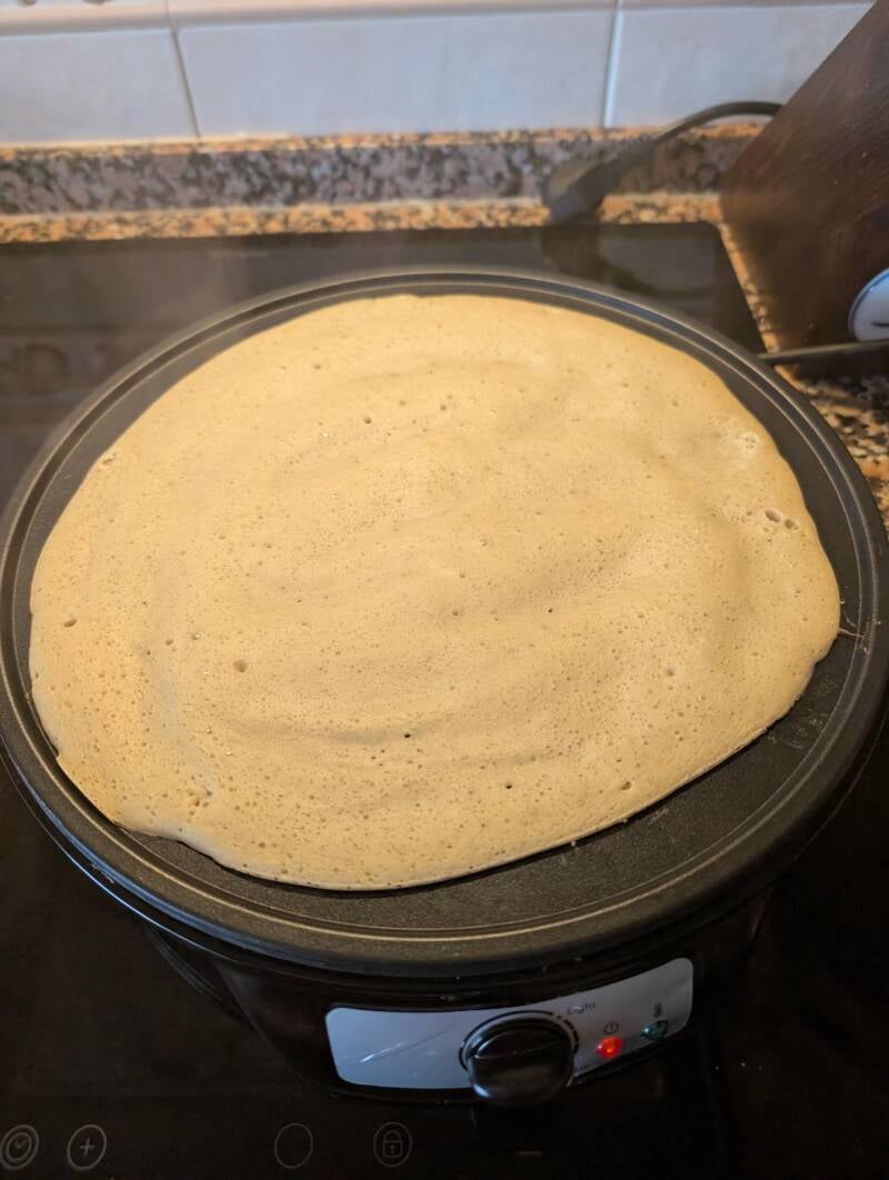 - Colocar numa crepeira/frigideira antiaderente a mistura, deixar cozinhar lentamente e depois virar a panqueca.